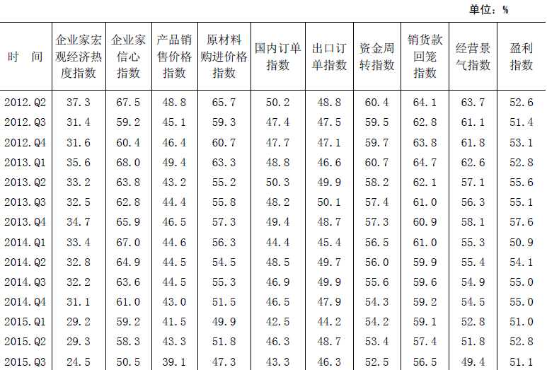 2015 年第三季度企业家问卷调查报告。调查结果显示:企业家宏观经济热度指数为24.5%,较上季下降4.8 个百分点,较去年同期下降7.7个百分点;产品销售价格指数为39.1%,较上季下降4.2个百分点,较去年同期下降5.4个百分点;出口订单指数为46.3%,较上季下降2.4 个百分点,较去年同期下降3.6个百分点;资金周转指数为52.5%,较上季下降0.8 个百分点,较去年同期下降3.1个百分点;经营景气指数为49.4%,较上季下降2.3 个百分点,较去年同期下降5.5个百分点。