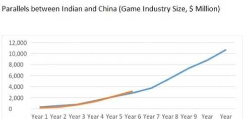 中国PC游戏市场规模与印度移动游戏市场规模的对比