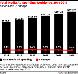 eMarketer预测全球广告支出将继续增长,但是比早前预测的要放缓。2015年全球广告支出将达到5696.5亿美元。这一指数比3月的预测(5777.9亿美元)要低,这主要是因为拉丁美洲、北美和欧洲广告支出比预计的要低。