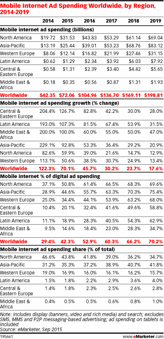 2015年北美仍然是全球广告支出最多的地区,达到1952.6亿美元。但是,到2019年亚太地区将超过北美成为最领先的广告市场。