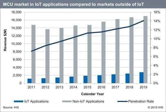 根据市场研究公司IHS表示,针对连网汽车、可穿戴电子设备、建筑物自动化以及其他有关物联网(IoT)应用的全球微控制器(MCU)市场预计将以11%的复合年成长率(CAGR)成长,从2014年的17亿美元增加到2019年时达到28亿美元的市场规模。