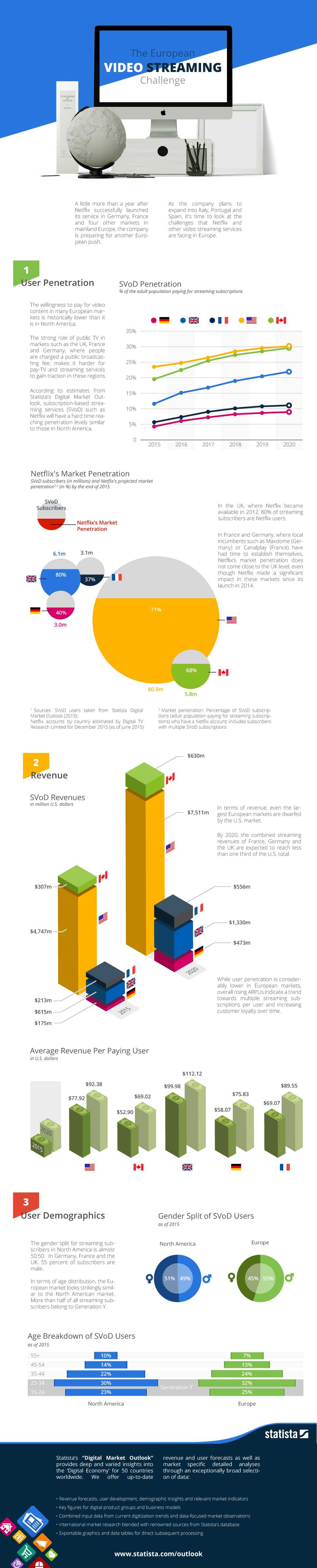 在北美发展成功后,Netflix开始尝试扩展欧洲市场视频流服务。去年,Netflix及其竞争对手Amazon在德国发布了流服务。欧洲市场点播视频服务(SVOD)订购似乎正在增长。Statista的数码市场展望发现欧洲点播视频订购并不像其他国家那样扩张。2015年北美有6700万消费者订购了付费视频流服务,收入约50亿美元。而且,Netflix在北美没有什么竞争对手,其用户占美国71%的点播视频服务订购,在加拿大占68%。在欧洲,视频点播服务订购有三个主要市场,约1200万用户,Netflix在德国占40%,在法国占37%,占英国视频点播用户的80%。