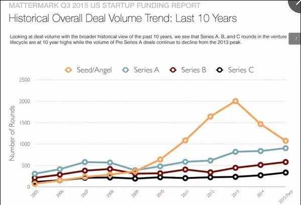 综合上述数据,也就是说:美国风投资金正集中配置到数量更少的一些公司里去;也可以理解为,风投资金在往项目后期走,美国天使投资正在回归。
