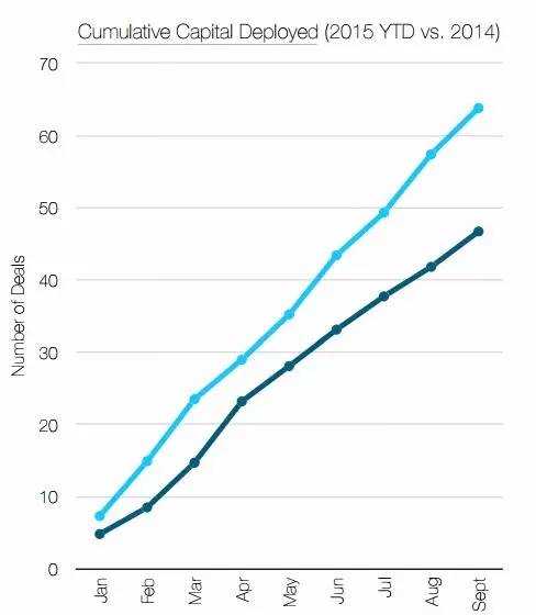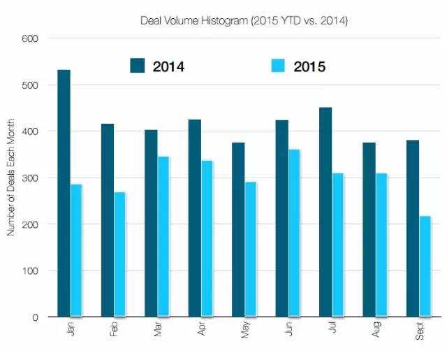 2)如果详细说 Deal 数,以各年 9 月 30 日为界,2013.9-2014.9 完成 3674 笔;2014.9-2015.9 只完成了 2699 笔。