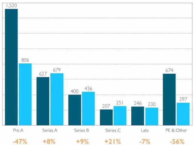 3)再看下各项目融资轮交易笔数:Pre A 阶段,笔数负增长 -47%;A 轮,正增长 +8%;B 轮,正增长 +9%;C 轮,正增长 +21%;
