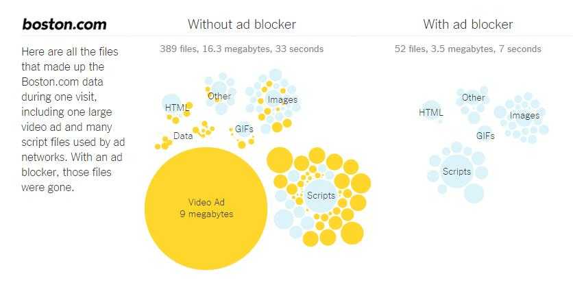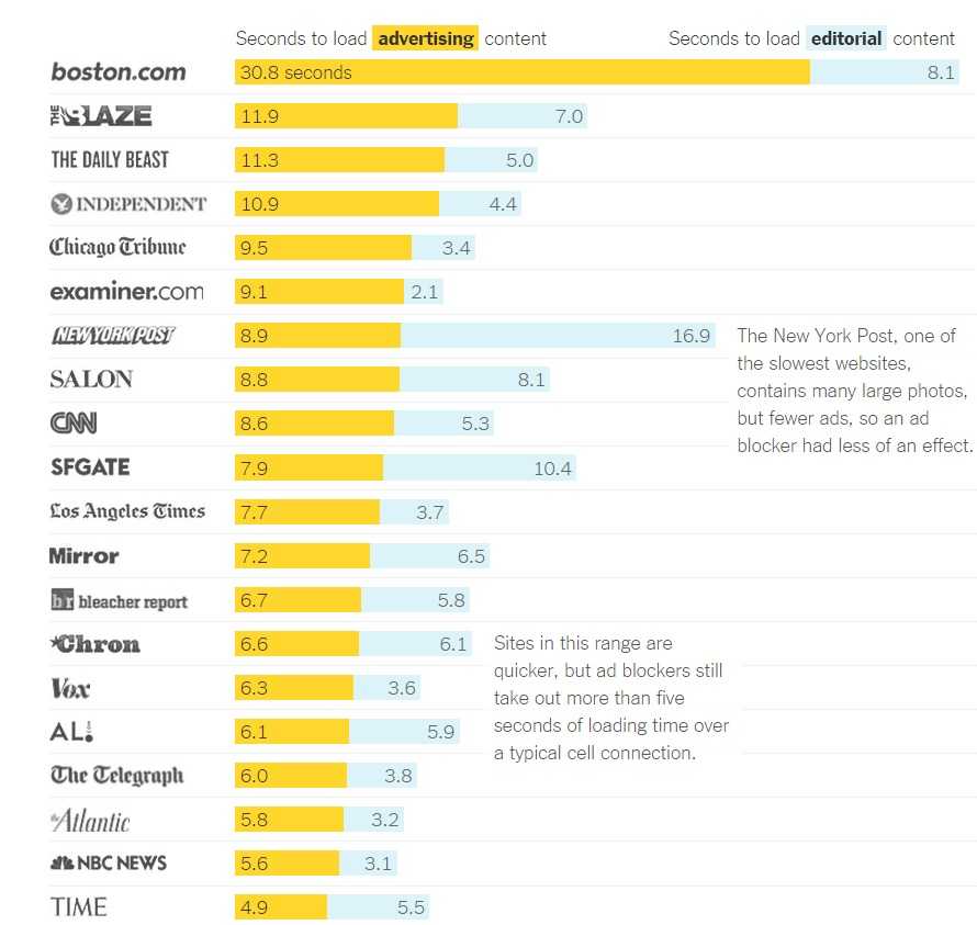 实验结果:对绝大多数网页来说,屏蔽广告后,其网页加载速度及浏览网页产生的流量均大幅减少,同时电池续航也有所提升(提升幅度约为21%)。拿Boston.com网站来说,屏蔽广告之前其网页加载流量为16.3M,而屏蔽之后只有3.5M,加载速度上,屏蔽之前为33秒,屏蔽后只需7秒,差别非常明显。