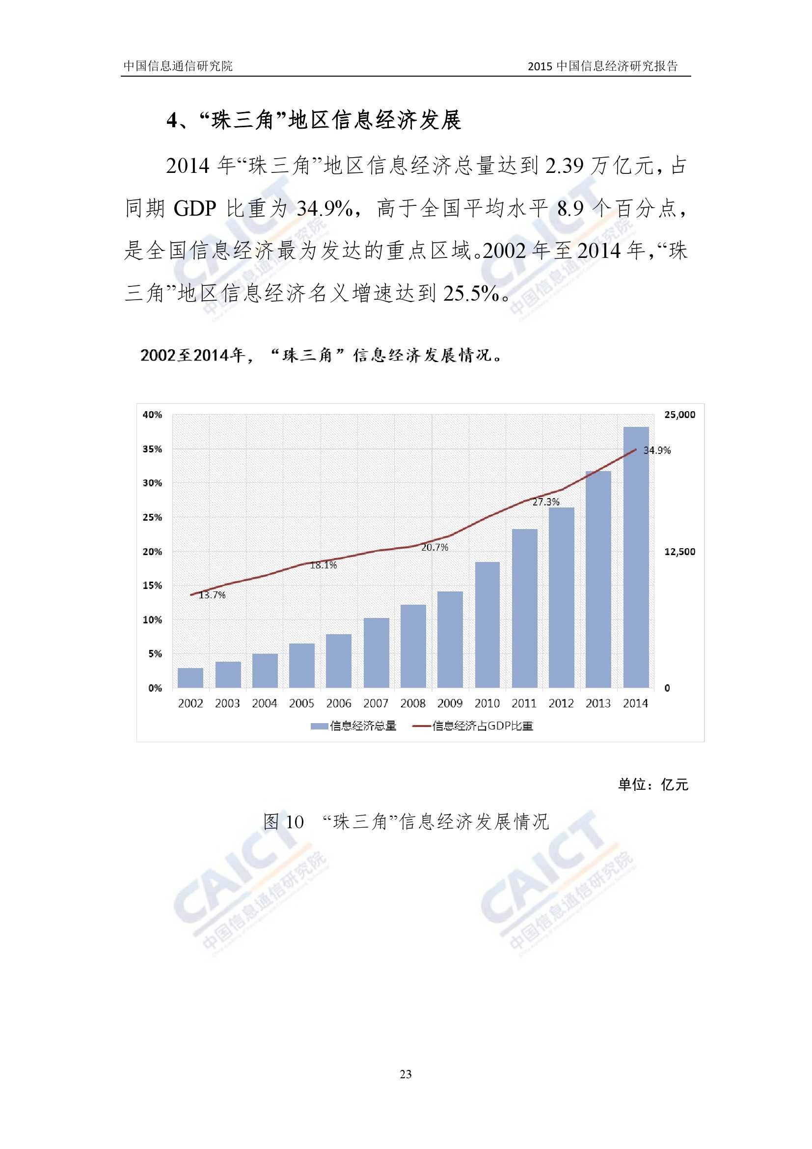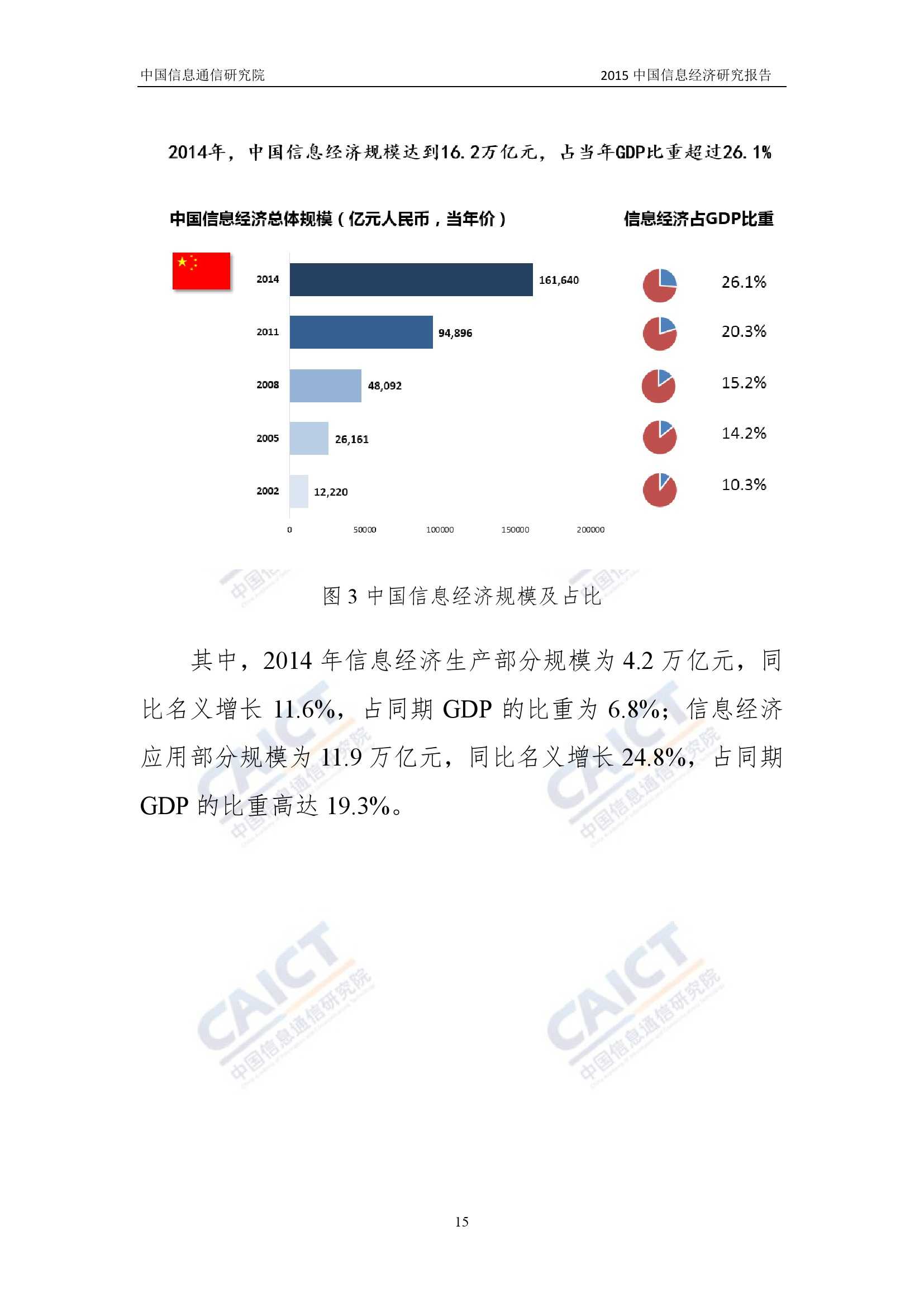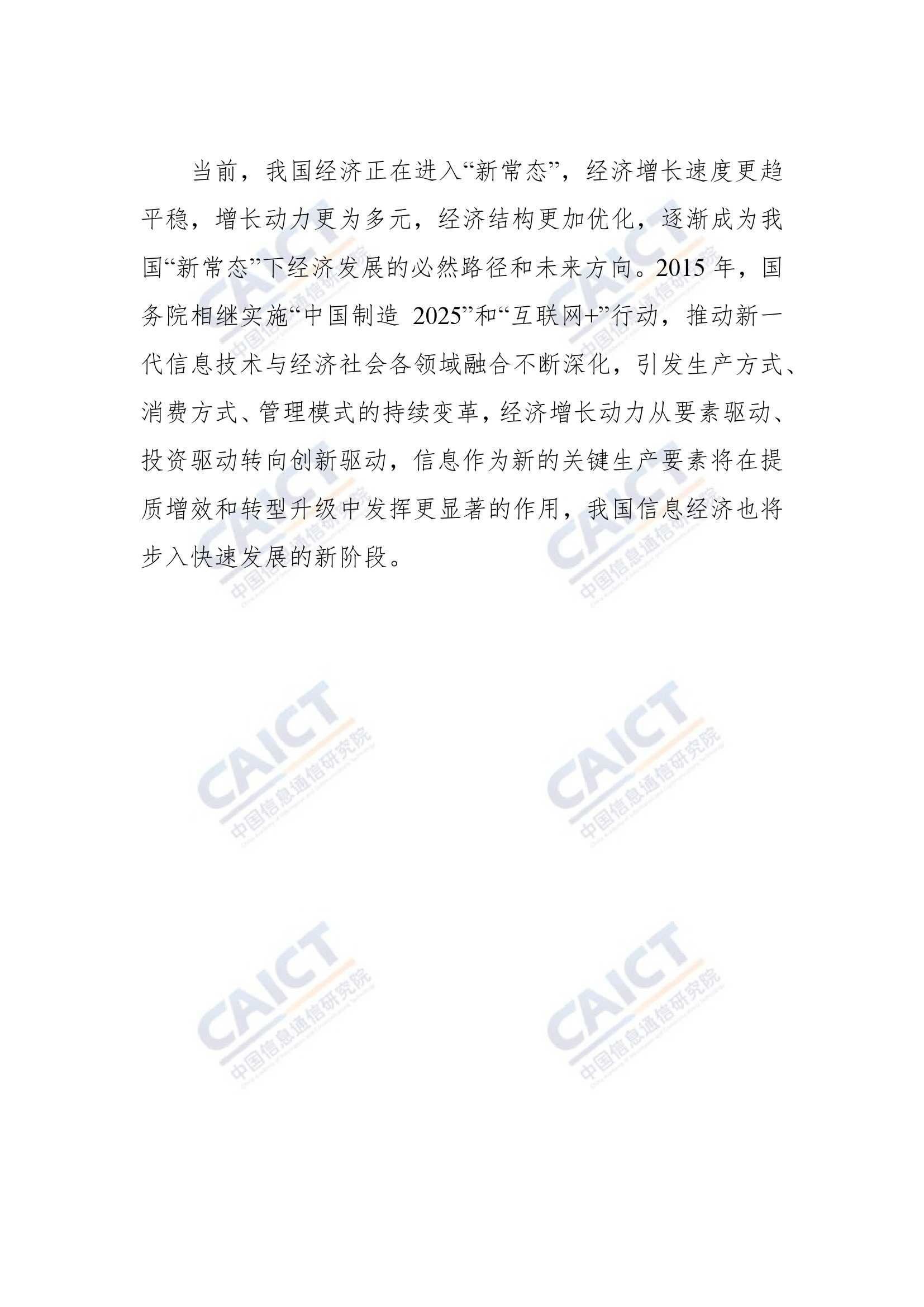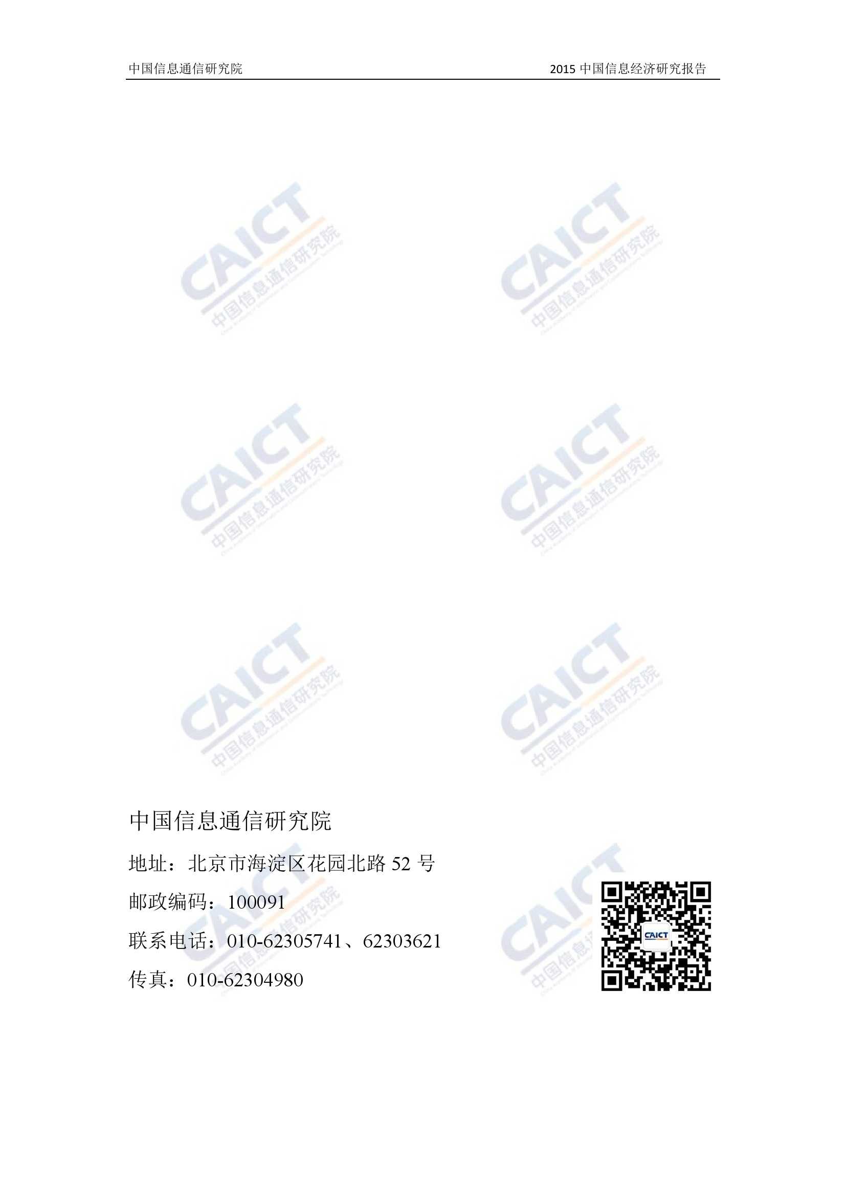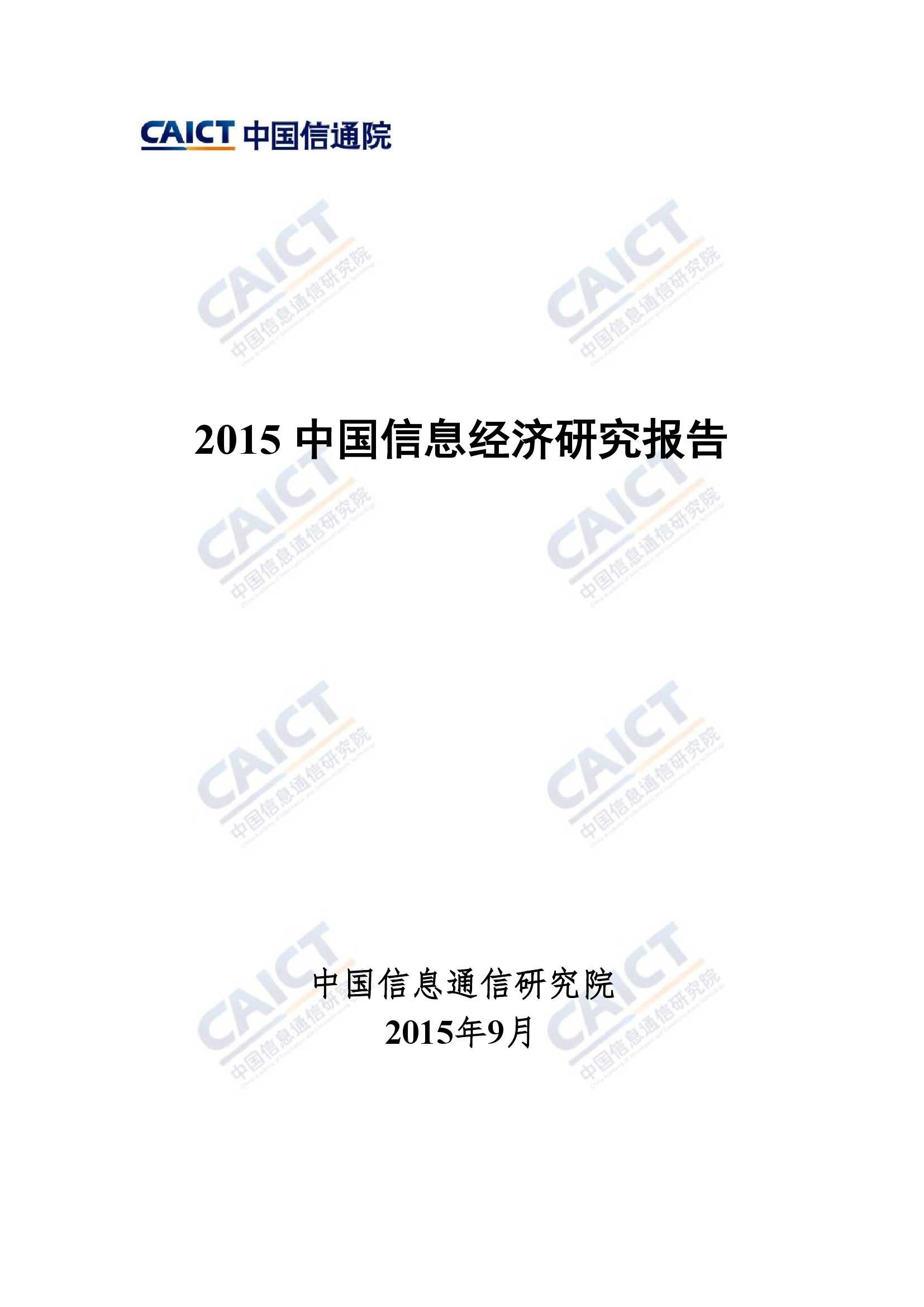中国信息通信研究院:2015年中国信息经济研究报告 更多阅读:阿里研究院:2015年网商发展研究报告微盟:2015年微信营销研究报告2015年中国专有云发展调查报告2015年中国公共云服务发展调查CBME:2015年中国孕婴童产业调查报告武书连:2015年中国大学排行榜AVC:2015年中国家电市场环境解析CNNIC:2015年第37次中国互联网络发展状况统计报告–个人互联网应用发展状况(九)Topdigital&妈妈帮:2015年中国母婴互联网营销新思维与新趋势Nielsen:2015年中国突破性创新报告CAICT:2015年中国大数据发展调查阿里妈妈:2015年Q2中国汽车消费车主洞察Deloitte:2015年中国移动消费者行为CNNIC:2015年第37次中国互联网络发展状况统计报告–企业“+互联网”广泛应用(五)CNNIC:2015年第37次中国互联网络发展状况统计报告–网民规模与结构(七)