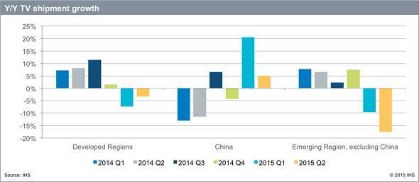 继2014年的持续增长后,全球电视出货量在2015年二季度比去年同期下挫8%,仅为4,800万台。这是继2009年二季度后最大的单季下跌。据IHS分析称电视出货的低迷主要与全球经济衰退相关。液晶电视出货量已占整体电视的99%,其出货量大幅下降直接影响到整体电视的需求。因显像管电视和等离子电视已全面退出,而液晶电视并未填补上这部分市场空缺。