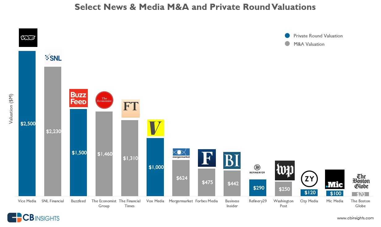 值得注意的是 Buzzfeed 和 Vox Media今年分别从NBC Universal获得了2.00亿美元的投资,使得他们成为强大的独角兽俱乐部(139家独角兽企业)的一员。现在,Axel Springer已经收购了Business Insider,其在发布后7年市值就达到4.42亿美元。