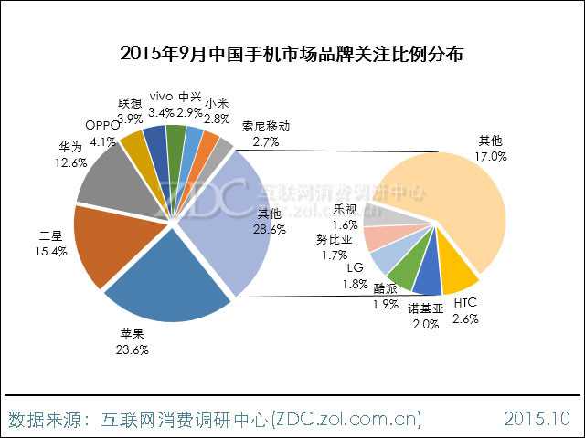 9月发布新品的苹果成为市场关注的焦点,借助新的iPhone 6S系列产品,苹果品牌关注度暴涨至23.6%,并跃居品牌榜首位。三星与华为分别以15.4%、12.6%的关注比例分居第二第三位。OPPO继续领跑第二阵营。整体来看,前十五品牌关注度累计仍在九成以下。