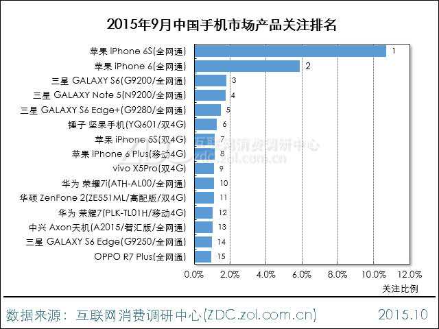 从产品关注来看,本月苹果iPhone 6S(全网通)以10.8%的关注比例在发布首月便成为最受用户青睐的机型,且以显著优势遥遥领先。