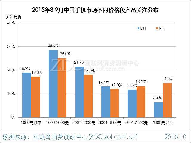 (图) 2015年8-9月中国手机市场不同价格段产品关注对比