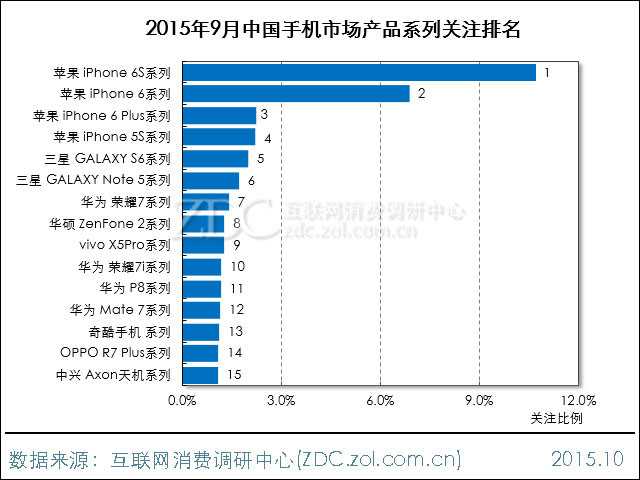 从产品系列来看,9月苹果新品iPhone 6S系列以10.7%的关注比例高居榜首,成为用户关注的焦点。苹果iPhone6系列则退居亚军位。苹果iPhone 6 Plus系列排在第三位。整体来看,苹果产品包揽了前四位,其中6S及6系列产品关注度遥遥领先。