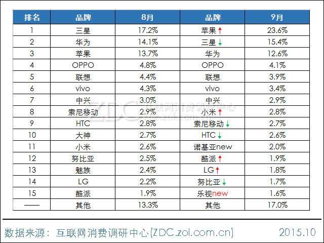 表 2015年8-9月中国手机市场品牌关注比例对比
