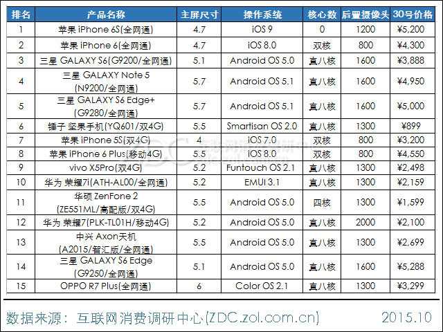 表 2015年9月中国手机市场最受关注的十五款产品及主要参数