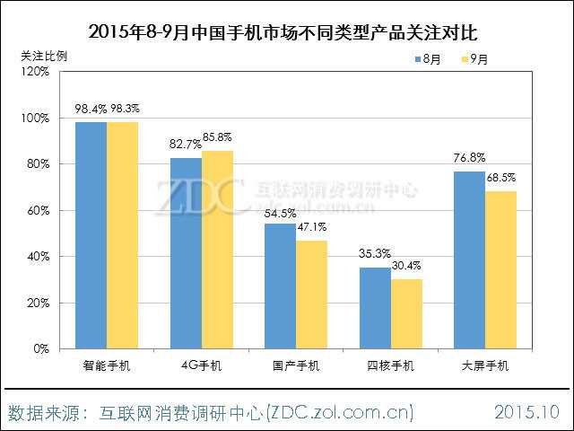 (图) 2015年8-9月中国手机市场不同屏幕尺寸产品关注对比