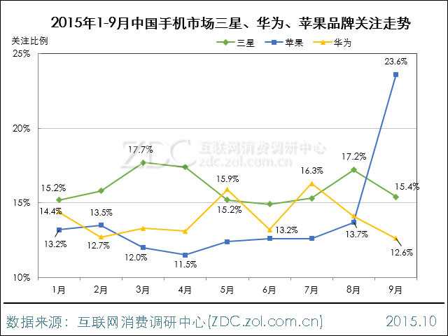 (图) 2015年1-9月中国手机市场三星、苹果、华为品牌关注比例走势