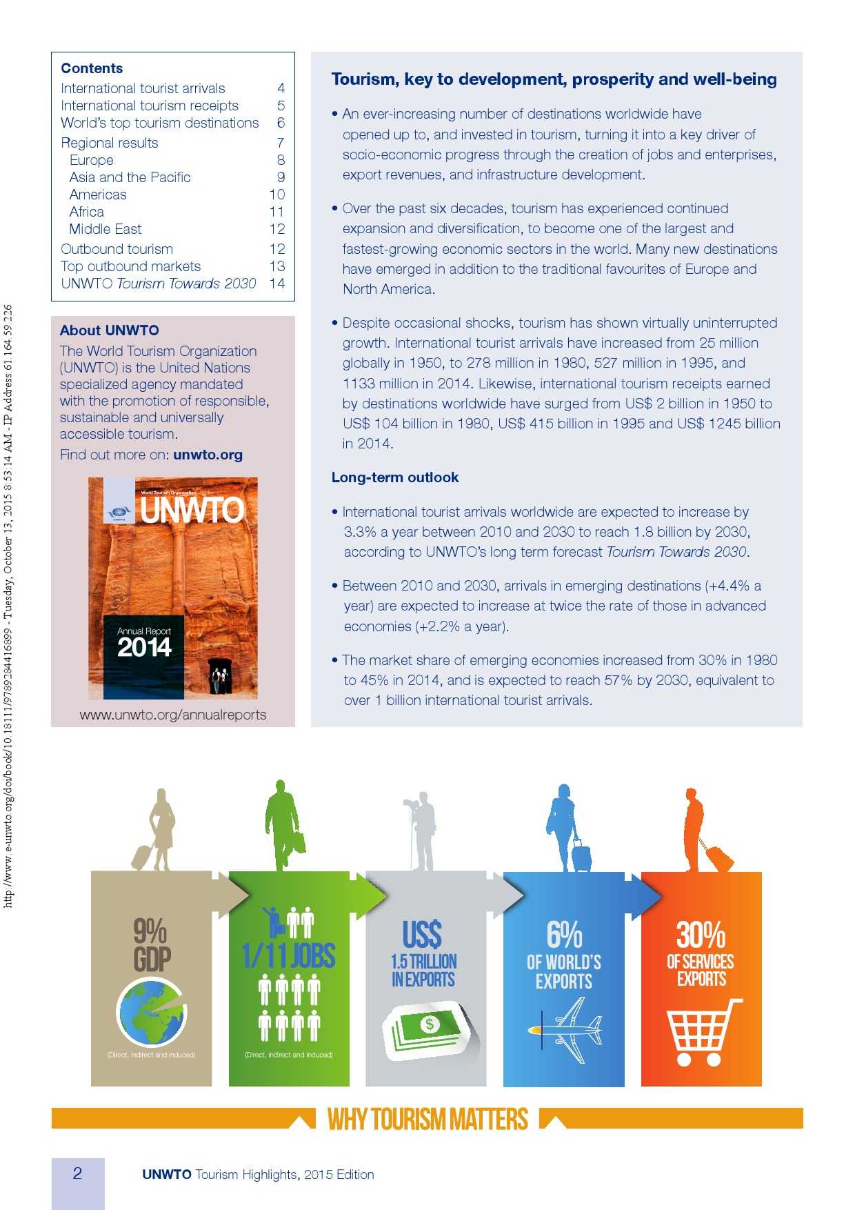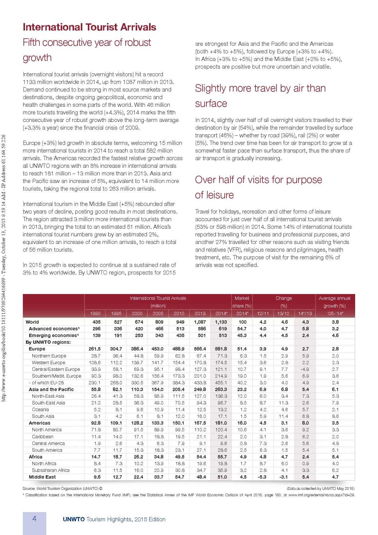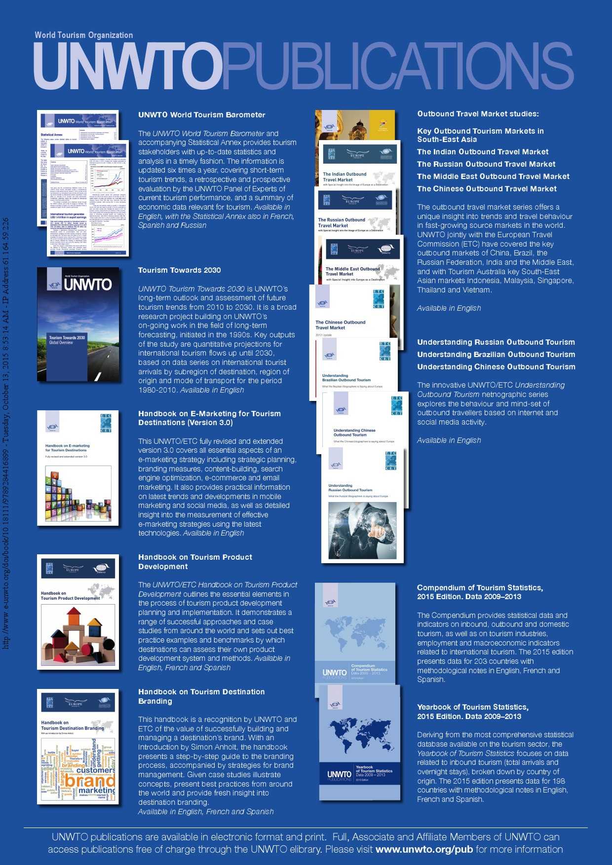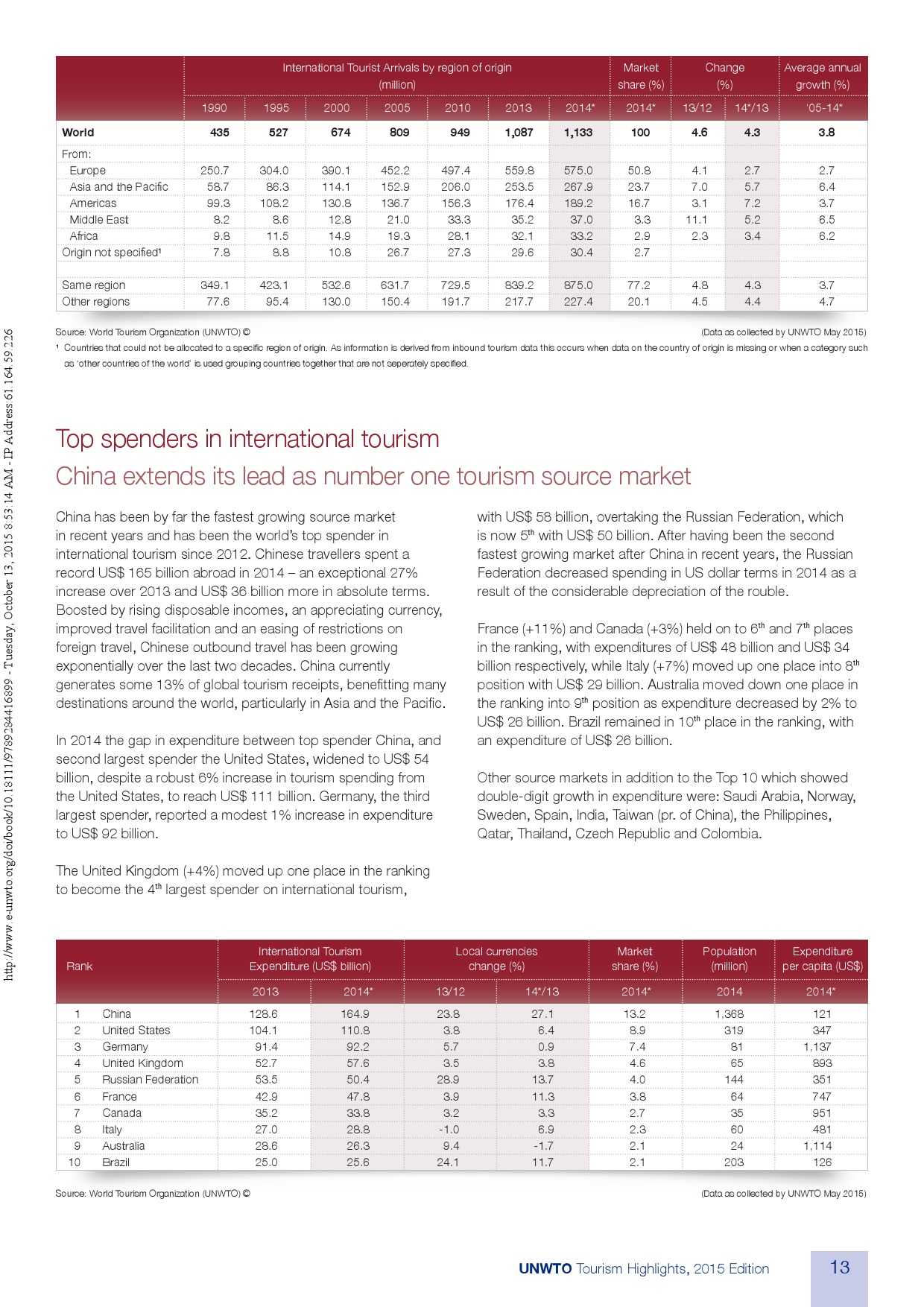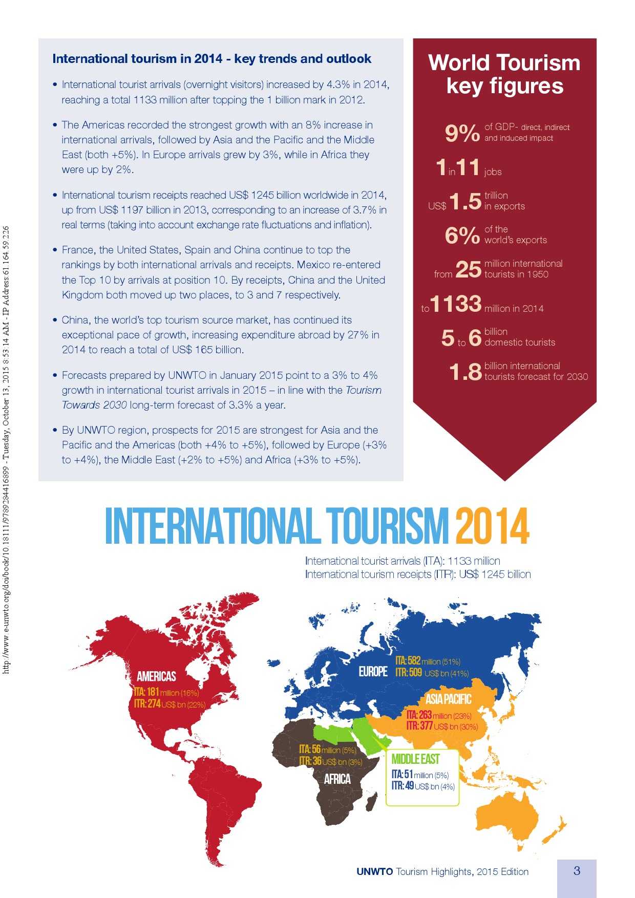 - 世界旅游组织(UNWTO)发布最新《2015全球旅游报告》(UNWTO Tourism Highlights 2015 Edition)。报告显示,世界旅游组织非常关注新兴目的地,经济体和目的地使用频度增加,中国元素继续成为关注焦点。2014年全球国际游客到访量达到11.33亿人次,国际旅游花费达12450亿美元。