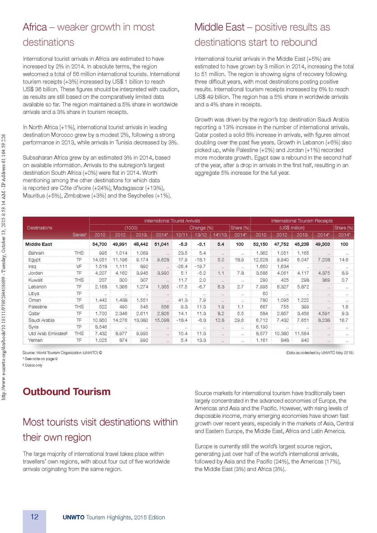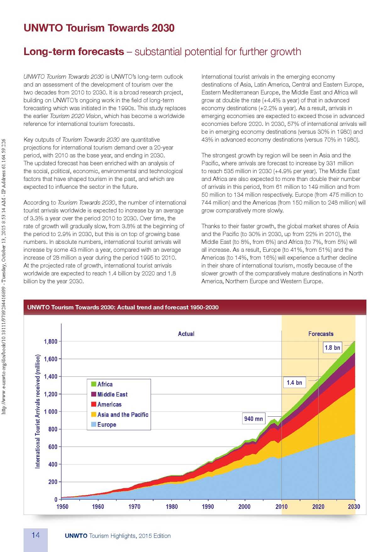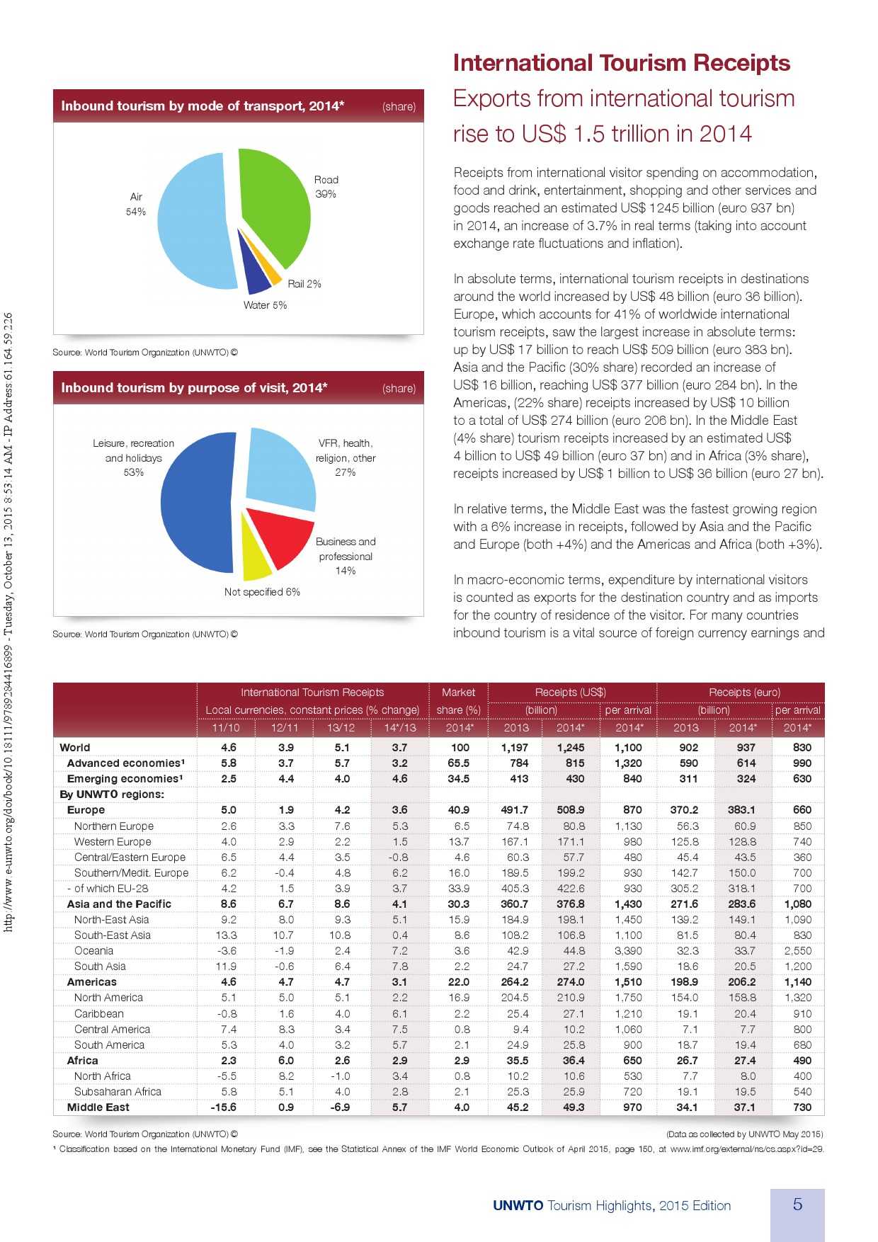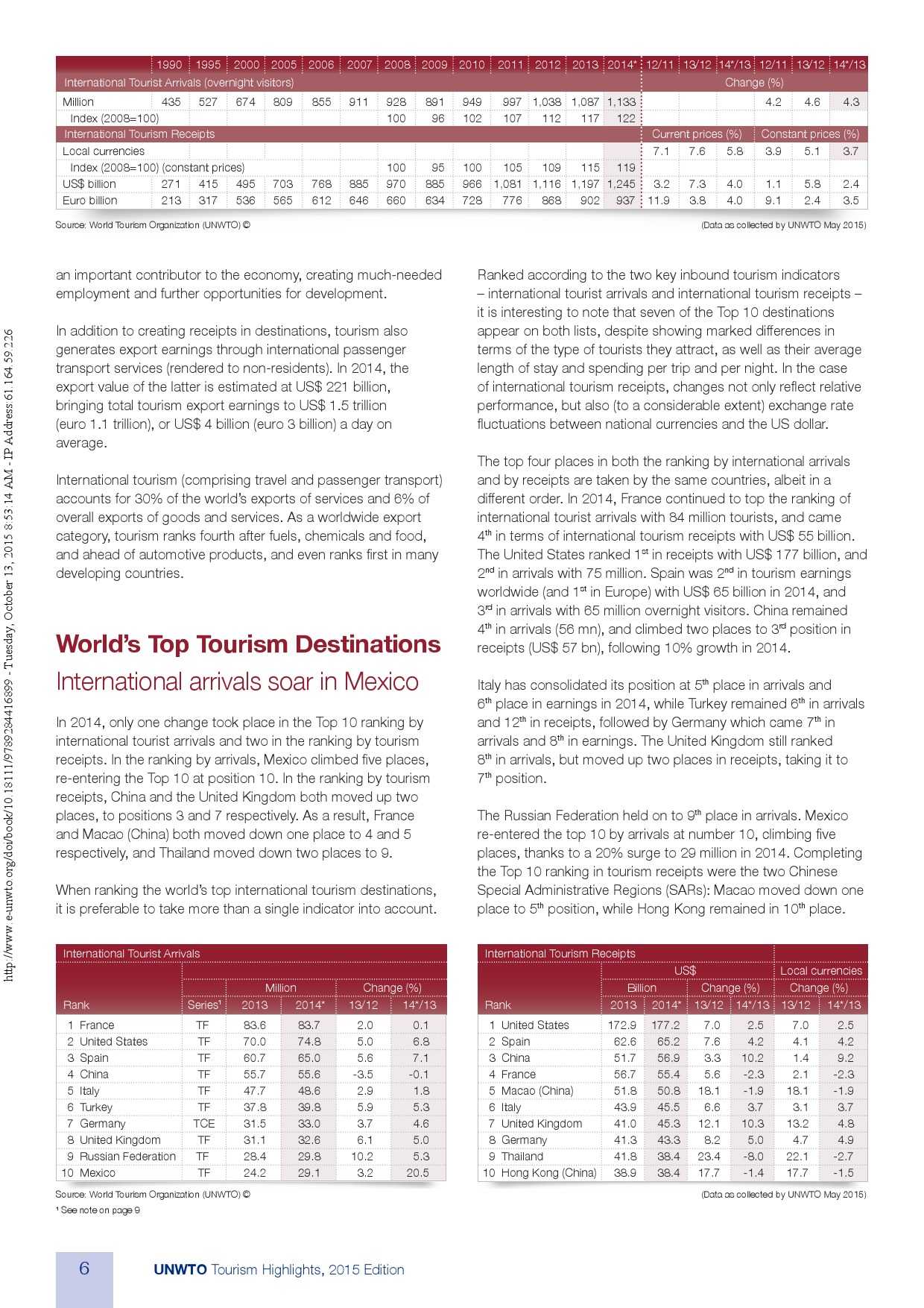 - 世界旅游组织(UNWTO)发布最新《2015全球旅游报告》(UNWTO Tourism Highlights 2015 Edition)。报告显示,世界旅游组织非常关注新兴目的地,经济体和目的地使用频度增加,中国元素继续成为关注焦点。2014年全球国际游客到访量达到11.33亿人次,国际旅游花费达12450亿美元。