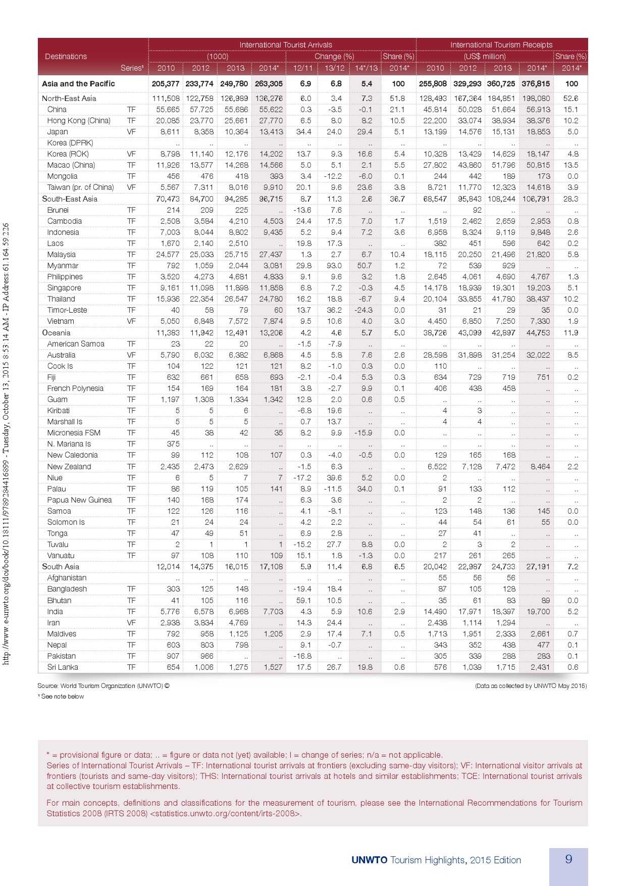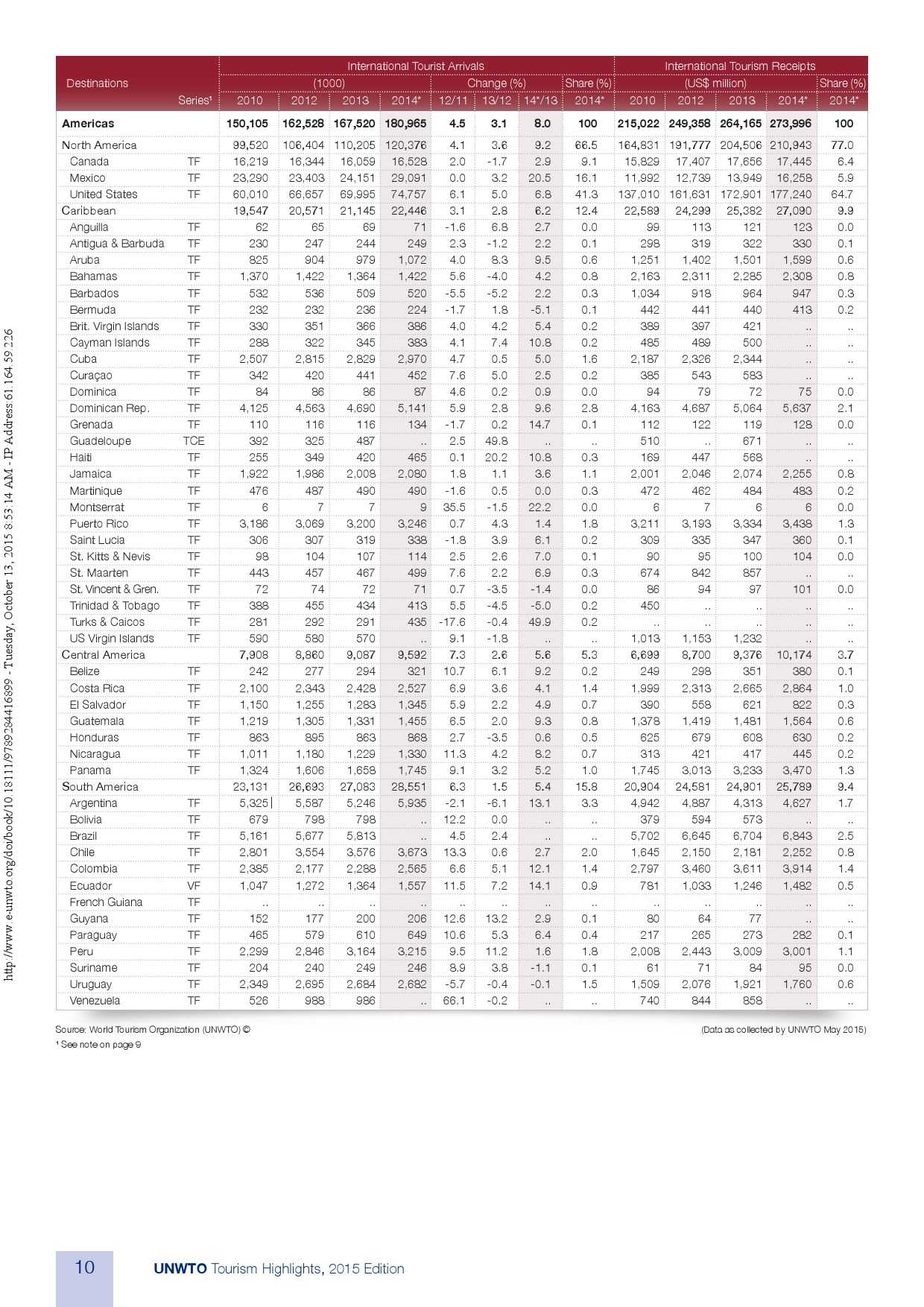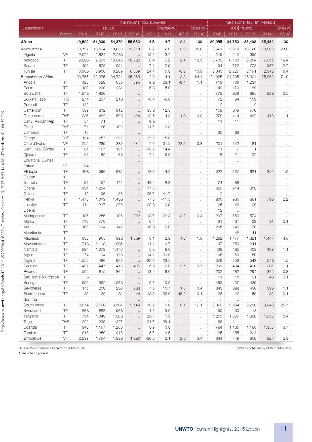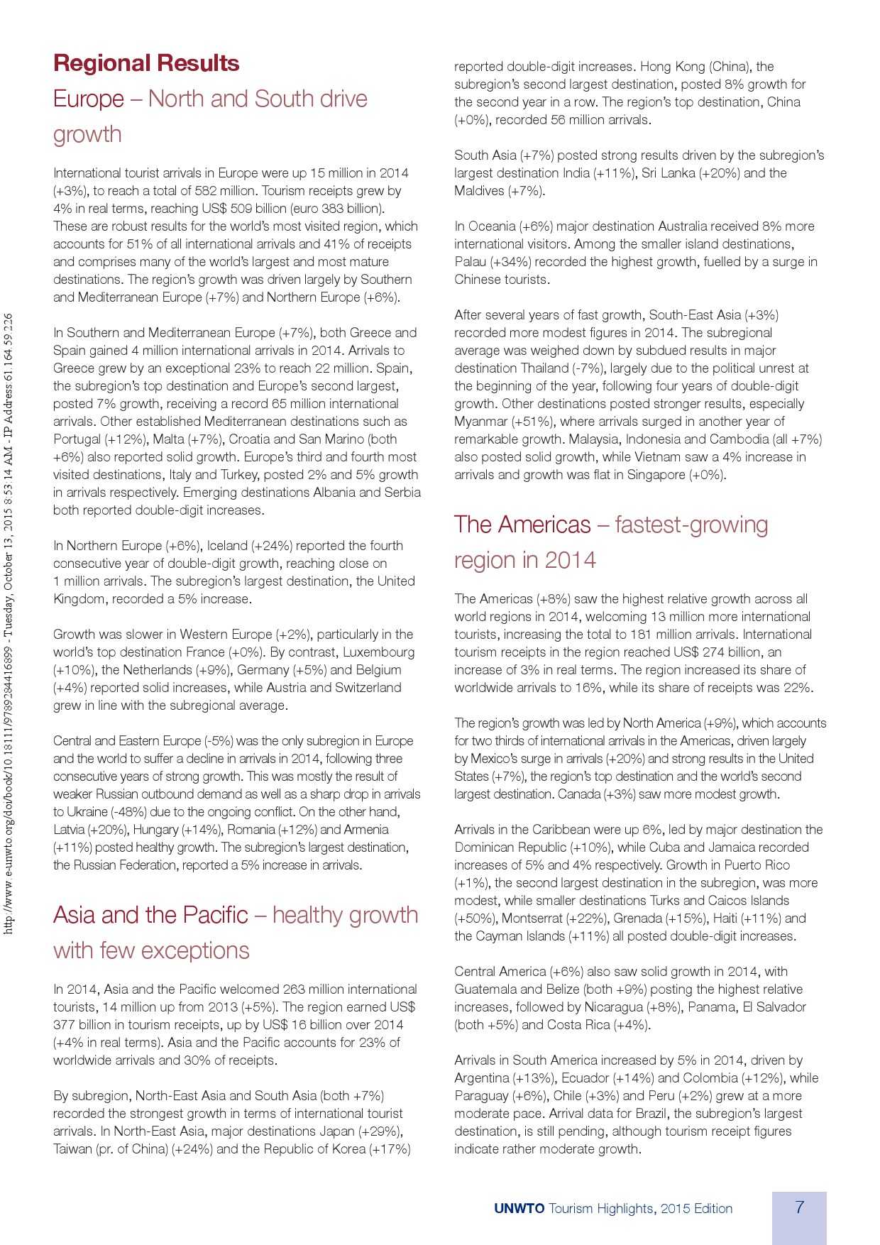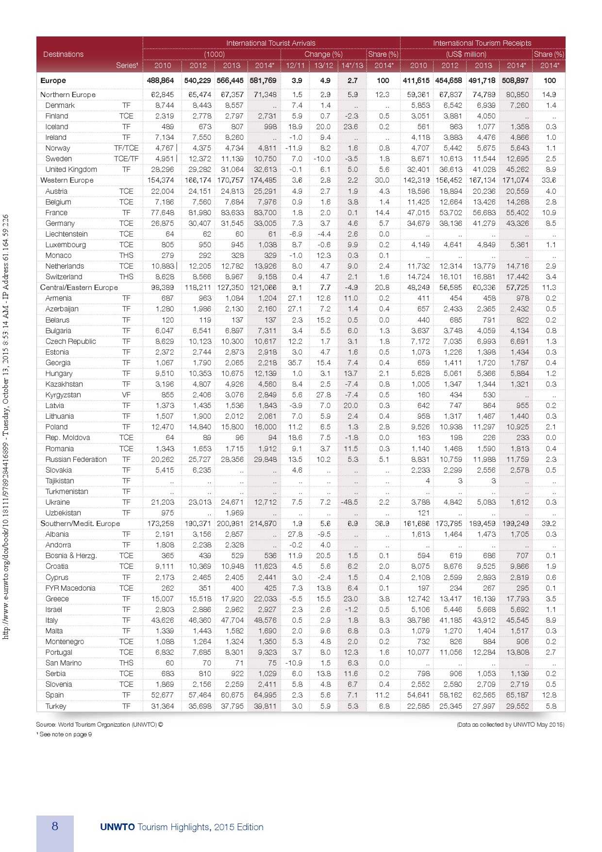 - 世界旅游组织(UNWTO)发布最新《2015全球旅游报告》(UNWTO Tourism Highlights 2015 Edition)。报告显示,世界旅游组织非常关注新兴目的地,经济体和目的地使用频度增加,中国元素继续成为关注焦点。2014年全球国际游客到访量达到11.33亿人次,国际旅游花费达12450亿美元。