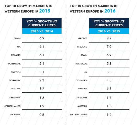 2015年西欧广告支出保持稳定增长,年增幅2.6%;2016年增幅2.9%,主要受到英国和西班牙的推动。