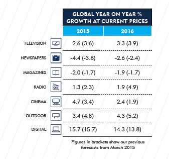 2015年全球广告支出预计增幅4.0%,略低于3月预测的4.6%,主要是由于俄罗斯和中国等市场预期下降。
