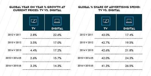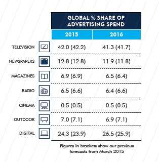 电视仍然主宰全球媒体广告支出,预计占2015年广告支出的42%。