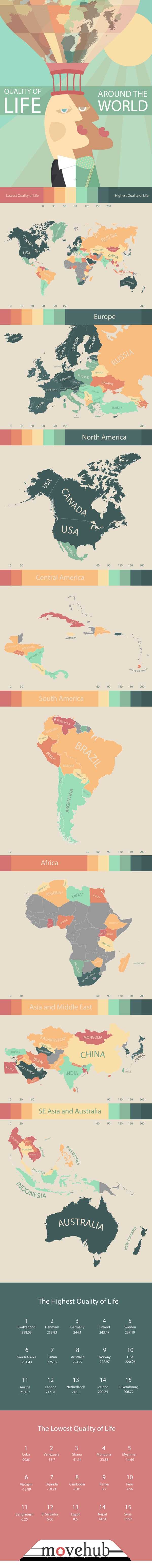 一张图懂全球各地生活质量–信息图 生活质量是由包括安全、医疗、消费水平、购买力、房价收入比等一系列因素影响的。下面这张图能够让我们简洁明了地了解各个地区的生活质量。图中下轴表示生活质量指数,左侧红色表示生活质量较低,甚至低于0;往右数字逐渐变大,最右侧深蓝色代表生活质量较高。 全球生活质量最高的十个地区分别是:瑞士,丹麦,德国,芬兰,瑞典,沙特阿拉伯,阿曼,澳大利亚,挪威,美国。最低的十个地区分别是:古巴,委内瑞拉,加纳,蒙古,缅甸,越南,乌干达,柬埔寨,肯尼亚,秘鲁。 编译/3sNews 更多阅读:职场文化中的性别差异问题 -信息图理享国:中国职场人消费洞察白皮书–信息图对于普通人来说,哪些发明最重要?–信息图全球LGBT权利的基本情况–信息图数读:6100万农村留守儿童被挡在城市门外–信息图月薪多少才能撑起一个家–信息图数读:台湾的购买力–信息图数局:回到63年前,伦敦PM2.5爆表的那一天–信息图数局:如果地球温度上升6℃–信息图21位极成功人士的睡眠习惯–信息图国双数据中心:二孩政策,上班族如何接招儿–信息图Domo:2021年互联网上的一分钟——信息图电子烟:到底能不能帮助戒烟–信息图信息图:网页加载速度到底对你的品牌有多大影响?工业物联网–信息图
