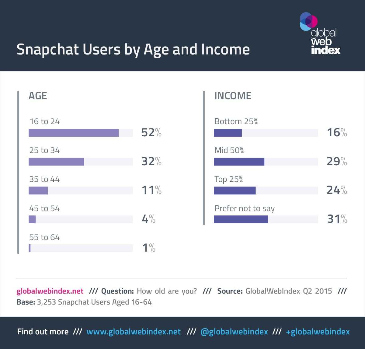 考虑到Snapchat用户的一些人口统计属性——倾向于年轻富有。超过半数Snapchat用户年龄在16到24岁,还有32%的用户年龄在25到34岁。而且使用量集中在最富有的25%的网民上。