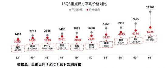 为应对上半年BP出货压力,下半年彩电市场再现价格战刺激市场需求。在厂商、渠道的推动下,价格进一步下调“再触底”。但随着趋优消费行为的普及,价格已不再是消费者更新、购买彩电类产品的障碍,寻找一台理想值得买单的产品才是关键。据奥维云网(AVC)线下监测数据显示,2015年三季度重点尺寸价格均有不同程度下降,热销的55寸均价下降幅度最大为12%,市场最低价达3122元,其次49英寸均价下降幅度为6%,市场最低价达2038元。60英寸以上产品,不断秀出自己的价格“下限”,价格下降成为了大尺寸电视爆发的重要支撑点。
