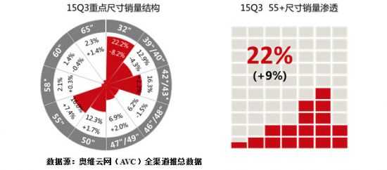 彩电大尺寸化的技术、需求、生态都已经具备,更为重要的是大尺寸彩电的价格在下降。消费者对大尺寸电视的支持率高居不下。2015年三季度彩电市场的平均尺寸上升至44.7英寸,同比增长2.5英寸。55+电视的市场占比为22%,同比增长9百分点,55英寸已成为厂商竞相逐鹿的尺寸。