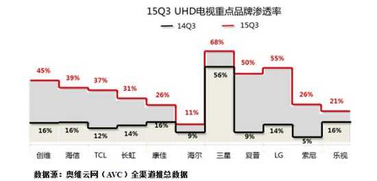 一方面14年开始上游面板厂商开始主推大尺寸UHD面板,另一方面随着UHD电视价位更加亲民,消费者对UHD电视的接受度不断提高,两方面因素促进UHD电视在大尺寸中的渗透较高。2015年三季度,UHD电视的市场占比为34%,同比增长19个百分点。其中国外品牌UHD电视的占比为38%,同比增长19.2百分点;国内品牌UHD电视的占比为33%,同比增长18.8百分点,国内外品牌正加紧UHD电视的布局和推广。