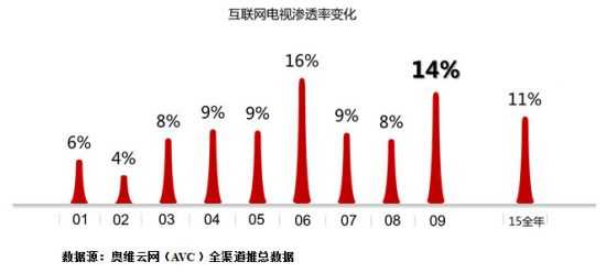 2015年,随着互联网品牌的异军突起,彩电行业再次走到风口浪尖,在饱和市场下,激烈竞争。互联网品牌依靠各自领域的软硬件与跨界资源的联通,不断扩大市场规模。目前已经进入的包括大麦、17TV、歌华、PPTV、微鲸、荣威和CAN,即将进入的品牌有暴风、优酷、风行。据奥维云网(AVC)推总数据显示,2015年三季度互联网品牌的零售量规模为121万台,市场占比达11%,相当于一个传统厂商的市场份额。