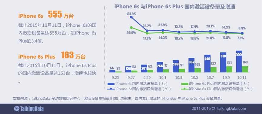 TalkingData:2015年iPhone6s 新机型国内激活设备量增长迅速 截止2015年10月11日,iPhone 6s 与 iPhone 6s Plus在国内激活设备量达718万。 与iPhone 6相比,iPhone 6s在发售同期内的国内激活设备量有小幅下降 iPhone两款新机型设备份额达4%,iPhone 6s 已进入国内iOS机型前十 与iPhone 6s相比,iPhone 6s Plus拥有更多一线城市用户 更多阅读:苹果被迫适应印度国情 iPhone6s上市两月降15%苏宁:预约苹果iPhone6s用户研究TalkingData:2020年“超职季”招聘市场洞察报告TalkingData: 谈《捉妖》御灵师的画像洞察TalkingData:2022春节年货数据TalkingData:从瑞幸咖啡“崩盘”事件 探究咖啡消费人群特征差异TalkingData T11 2019数据智能技术峰会举办 AI将成为行业颠覆者TalkingData:“数”说瑞幸咖啡、星巴克人群特征T11 2018数聚零售峰会举办,聚焦新零售变革突破以突破诠释数据的力量,2018年T11数据智能峰会即将举办TalkingData发布新战略布局 CEO崔晓波:要以开放连接促数据智能T11 2017 暨TalkingData智能数据峰会开幕倒计时,九大论坛前瞻TalkingData&宜人贷:中国消费金融发展模式研究报告TalkingData:2017年消费金融行业发展报告新年新征程,TalkingData营销云全新启航