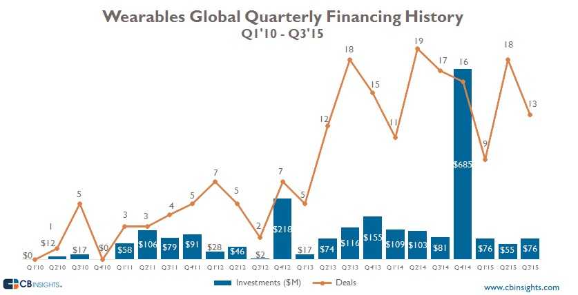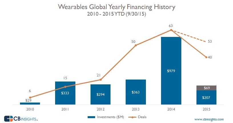 虽然有众多大事件,但是可穿戴计算行业私营企业的注资环境已经冷却下来。根据CB Insights 的数据,2015年可穿戴技术融资额2.76亿美元,年降幅72%,降至自2020年最低点。
