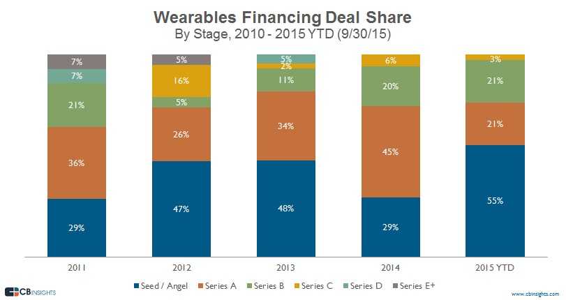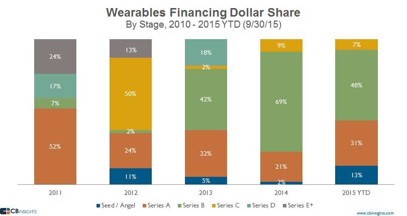 融资份额方面,中间阶段所占融资份额最高。自2012年,中间阶段(B轮和C轮)占可穿戴初创企业年融资额的50%到80%。2015年中间阶段交易占融资额的55%。