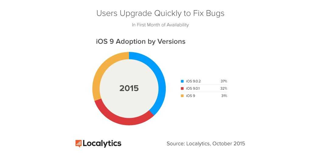 Apple倾听用户的反映,并设计了两个漏洞修复版本,9.0.1 和 9.0.2。因此,已经更新了iOS 9的用户中69%选择更新更稳定的版本,这也验证了用户对漏洞的担忧。