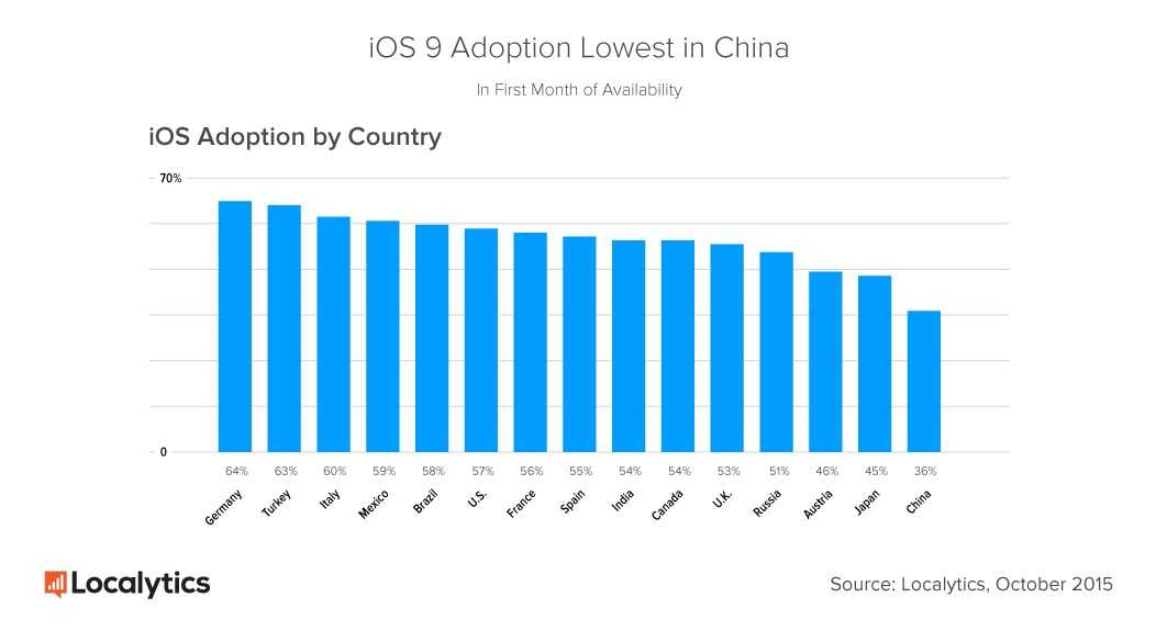 在欧洲,iOS 9采用在德国、土耳其和意大利是最快的,分别达到64%, 63% 和60%。