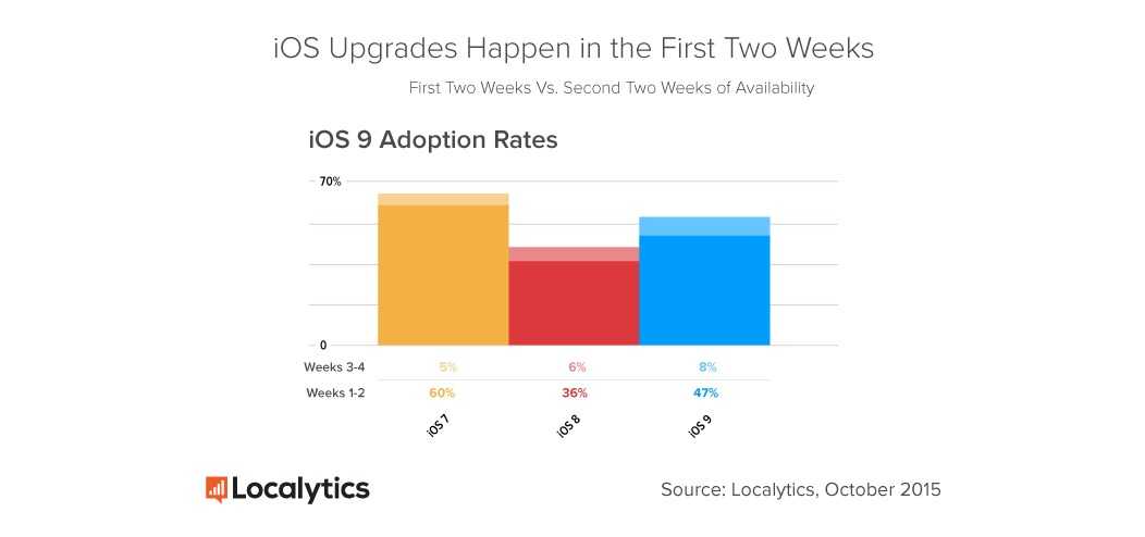 在iOS 9发布后头两周就有47%的用户进行了更新,但是第三周和第四周只有8%的用户更新。早期采用热潮显示了果粉对品牌的热情,通常会尽可能早地更新,但是其他人会等待清除漏洞。正如下文现实的,iOS 9确实漏洞百出。