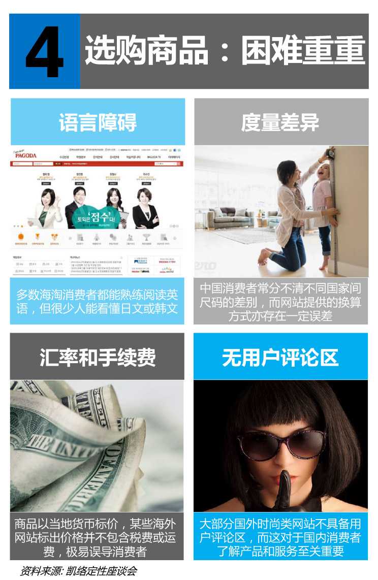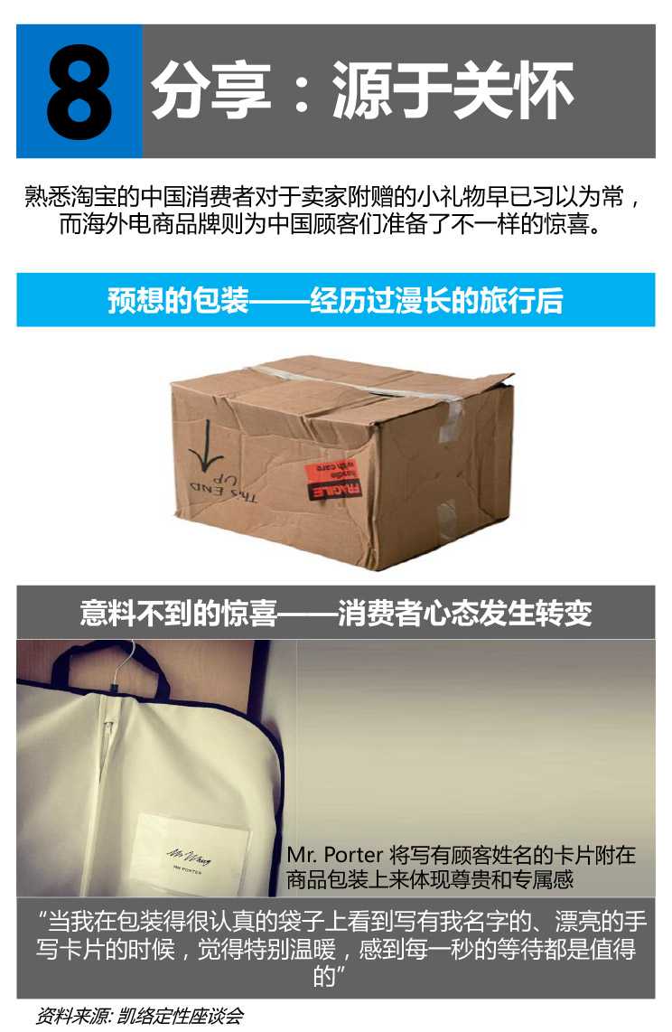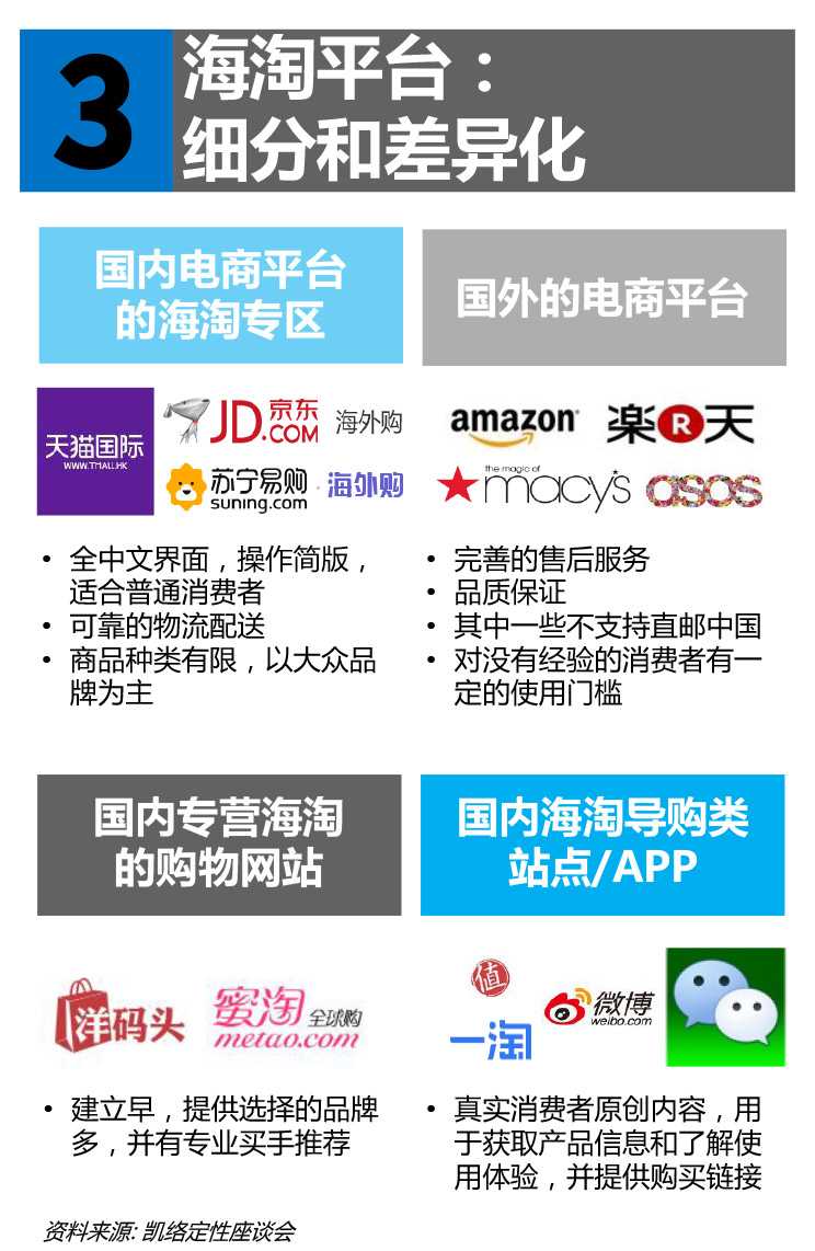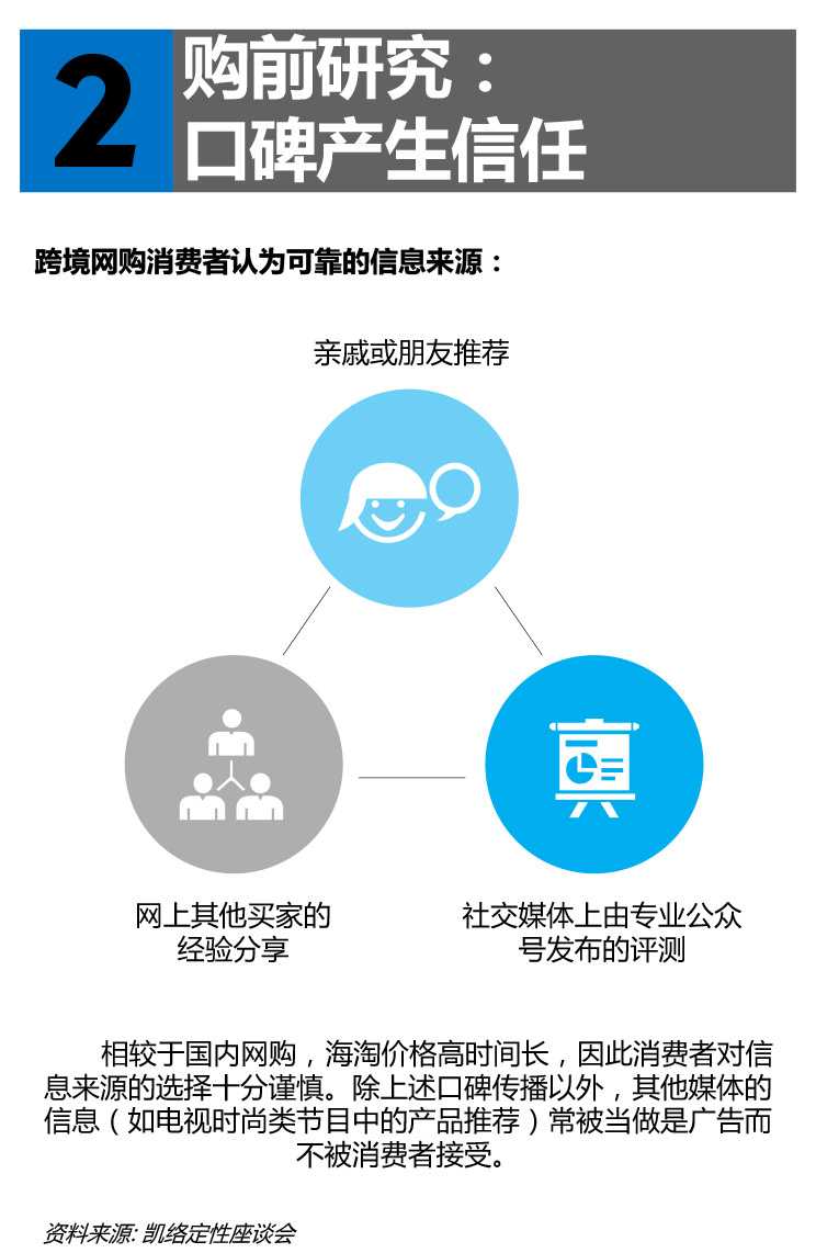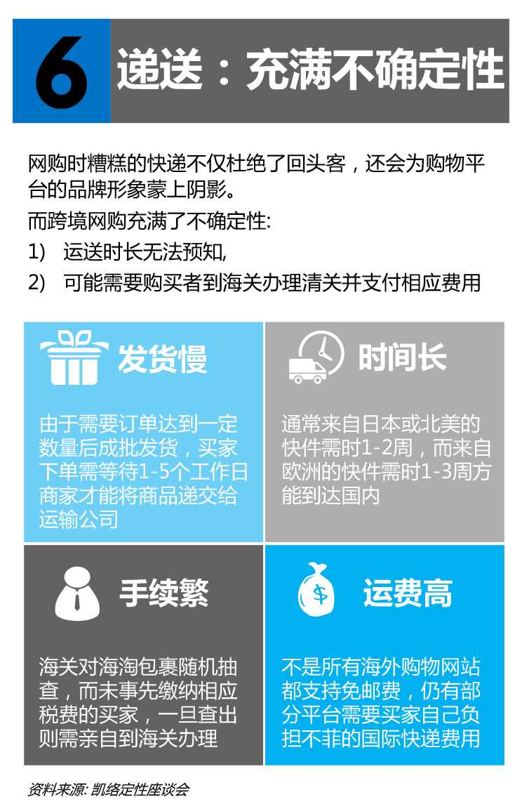 凯络:2015中国跨境网购报告 凯络中国最近发布了《跨境网购——国际电商的新机遇》报告,运用凯络定性研究工具CHEMISTRY,分析了跨境网购的主要人群及其海淘旅程,分8个部分——海淘动机、购前研究、海淘平台、选购商品、支付诉求、递送、售后服务、分享对跨境网购(海淘)行为进行阐述,勾勒出国际电商的发展新趋势。 更多阅读:2015中国互联网电视发展研究报告企鹅智库:2015中国互联网金融趋势报告Linkedin:2015中国互联网行业人才库报告凯络:2016 年中国媒体市场景观ChannelAdvisor:2015年3月畅路销跨境电商同店销售额网易有道:网购价格不完全报告 深度:L2发布中国2015个人护理,美妆营销报告,本土品牌优势明显用数据说一个2015营销世界的故事2015上半年小米应用商店报告福布斯:2015日本富豪榜 优衣库创始人柳井正重夺首富Cardnotpresent:2013年跨境电子商务报告(一)跨境电商市场分析:巴西最受欢迎的十大购物网站Payvision:2013年跨境电子商务报告(二)凯络:预测2017年全球广告支出将强势增长 4.5%凯络:2016年电视资源招标数据解读