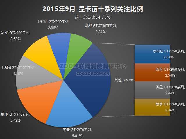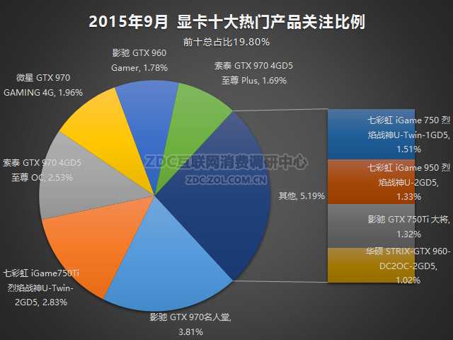 ZDC调研中心数据显示,2015年9月中国显卡市场上,索泰 GTX970系列获得了5.81%的市场关注比例,成为一大黑马,影驰 GTX970系列关注比例为5.42%获得第二,差距只有0.39%。七彩虹 GTX750Ti的关注比例为4.18%,影驰 GTX960 系列占比3.68%,七彩虹 GTX960 系列关注比例2.86%,影驰 GTX750Ti系列2.81%。