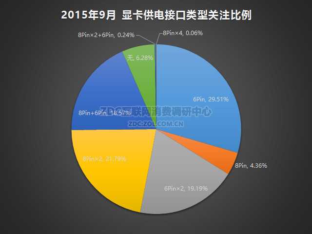 2015年9月中国显卡市场上,供电接口类型为6Pin的产品关注比例为29.51%,8Pin×2占比21.79%,6Pin×2占比为19.19%,8Pin+6Pin占比18.57%。