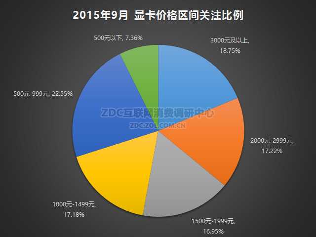从价格方面看,2015年9月的中国显卡市场上,500元-999元的显卡产品关注比例最高,为22.55%。其次是3000元及以上的产品,关注比例为18.75%。2000元-2999元的产品关注比例为16.95%,1000元-1499元的产品占比17.18%《1500元-1999元关注比例16.95%,500元以下7.36%。可以看出,消费者的关注度还是集中在3000元以下的显卡产品上的。
