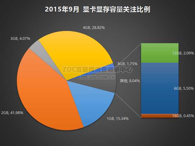 从显卡的显存容量上看,2015年9月中国显卡市场上,2GB显存容量的显卡是市场的主流,关注度比例为41.98%,4GB产品的关注度也很高,达到28.82%。市场上的显存类型还有1GB,关注度比例为15.34%,3GB占比4.07%,8GB占比1.75%等。