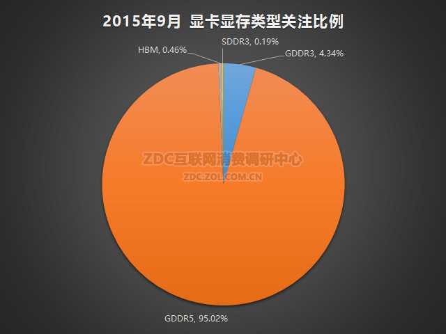 显存类型为GDDR5的显卡关注比例为95.02%,遥遥领先于其他类型的显存,在市场上占有绝对优势。GDDR3占比4.34%,HBM占比0.46%,SDDR3占比0.19%。