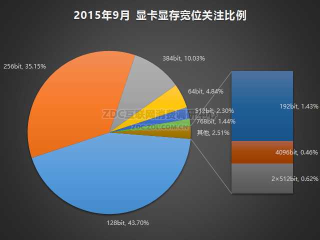128bit显卡的关注度比例为43.70%,256bit产品的关注比例为35.15%,384bit占比10.03%,64bit产品的关注比例为4.84%。