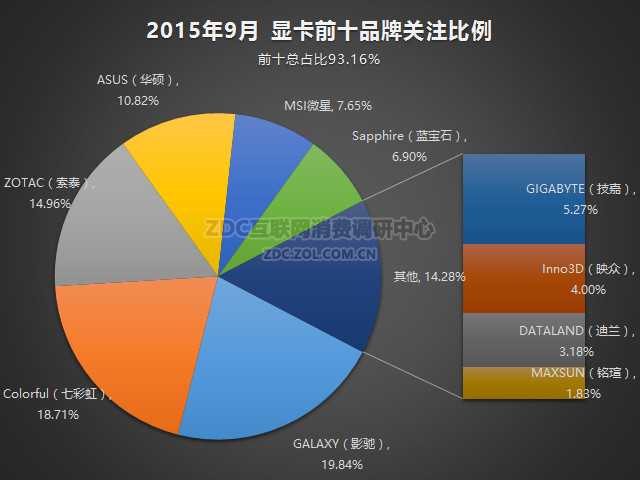 2015年9月中国的显卡市场上,影驰以19.84%的关注比例成为冠军,七彩虹的关注比例为18.71%紧随其后。其次,索泰的关注比例为14.96%,华硕10.82%。其它热门品牌还有微星、蓝宝石、技嘉、映众、迪兰和铭瑄,然而这些品牌的关注比例都不足10%。