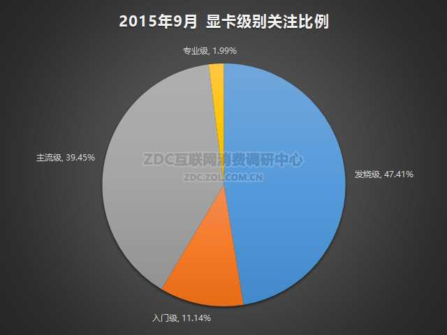 2015年9月中国显卡市场上,47.41%的关注度都集中在发烧级显卡上,主流级显卡次之,关注比例为39.45%,入门级显卡占比11.14%,专业级显卡1.99%。
