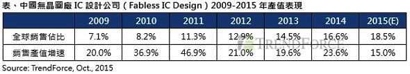 根 据TrendForce旗下拓墣产业研究所的统计,中国自2009年以来,透过强大的市场购买力与自有品牌的茁壮,中国IC设计业产值在全球市场的占有率 逐步攀升,从2009年的7.1%,预计在2015年有机会达到18.5%,而销售产值更以年复合成长率25%的增速高速成长。