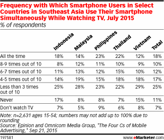 根据2015年7月Epinion 和 Omnicom Media Group的调查,在印度尼西亚、马来西亚、菲律宾、泰国和越南,7%的智能手机用户不看电视,还有11%的用户从没用移动设备收看过电视。使用智能手机收看电视的用户比例在泰国最高(87%),在印度尼西亚最低(76%)。